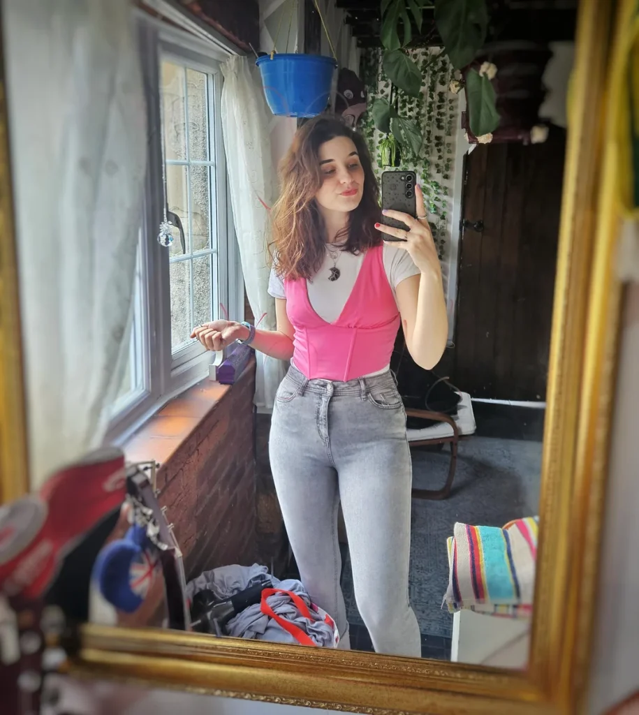 r/Rosaaleigh brought back the early 2000s with that pink structured vest over a white tee and grey jeans. This is what happens when you raid your older sibling’s closet from 2003 and make it work for today.