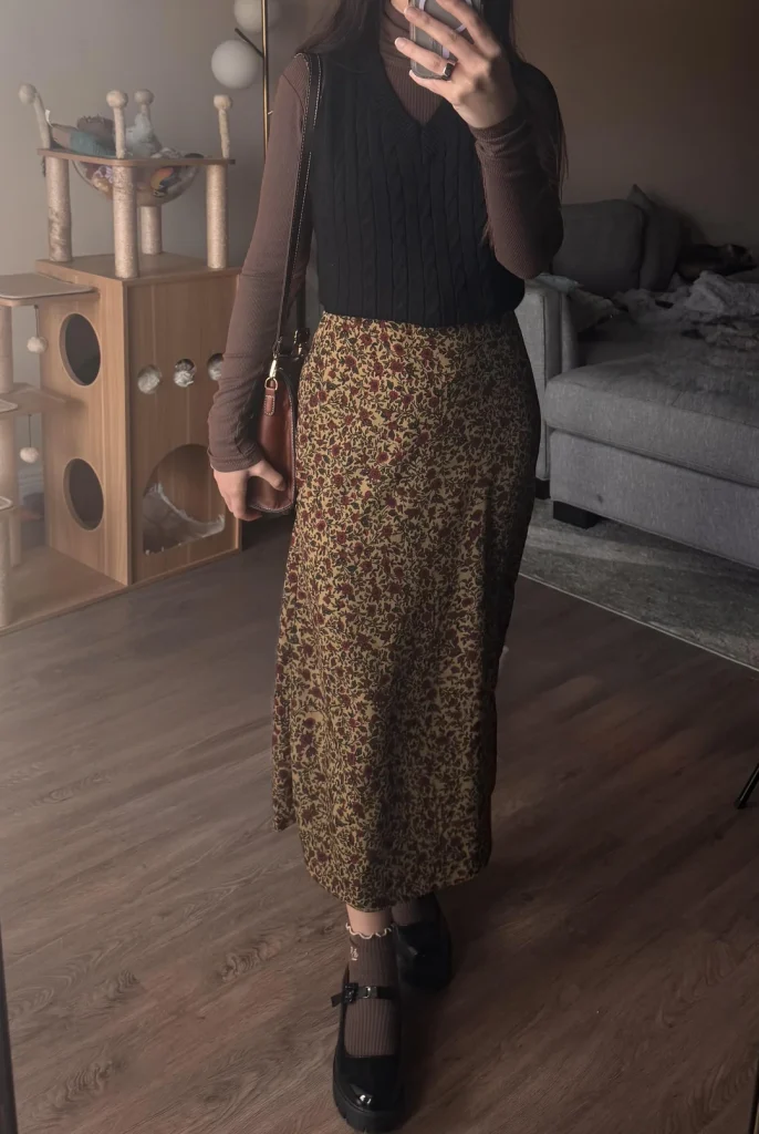 r/Vexxly nailed the cozy aesthetic with that black ribbed sweater under a brown cardigan, paired with a floral midi skirt. This is giving autumn vibes year-round, and I’m here for it.