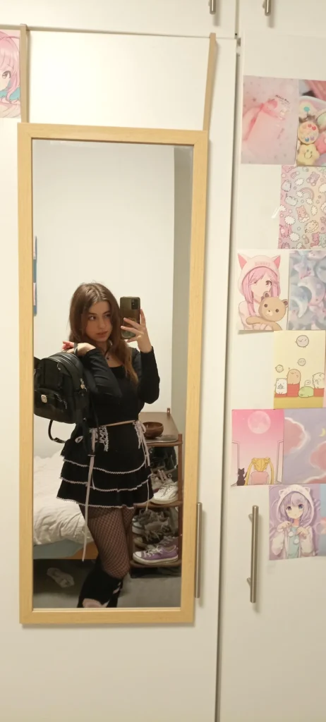 The fishnet tights add texture and edge, and those chunky platforms are both practical and aesthetic. The small backpack is functional while adding to the overall vibe anime patches visible in the background suggest this person knows exactly who they are style-wise.