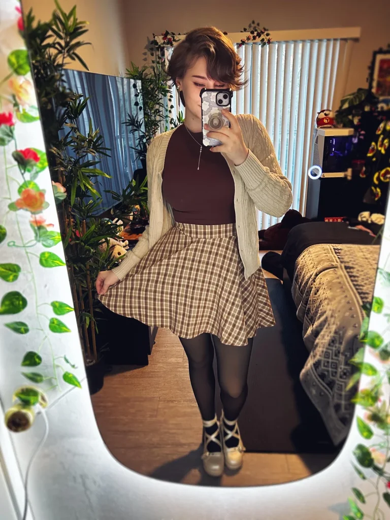 r/Kotoriichi created something unexpected with that brown fitted turtleneck under a cream cable-knit cardigan, paired with a brown plaid mini skirt, black tights, and platform Mary Janes. This is what happens when you mix aesthetics and somehow make it work.
