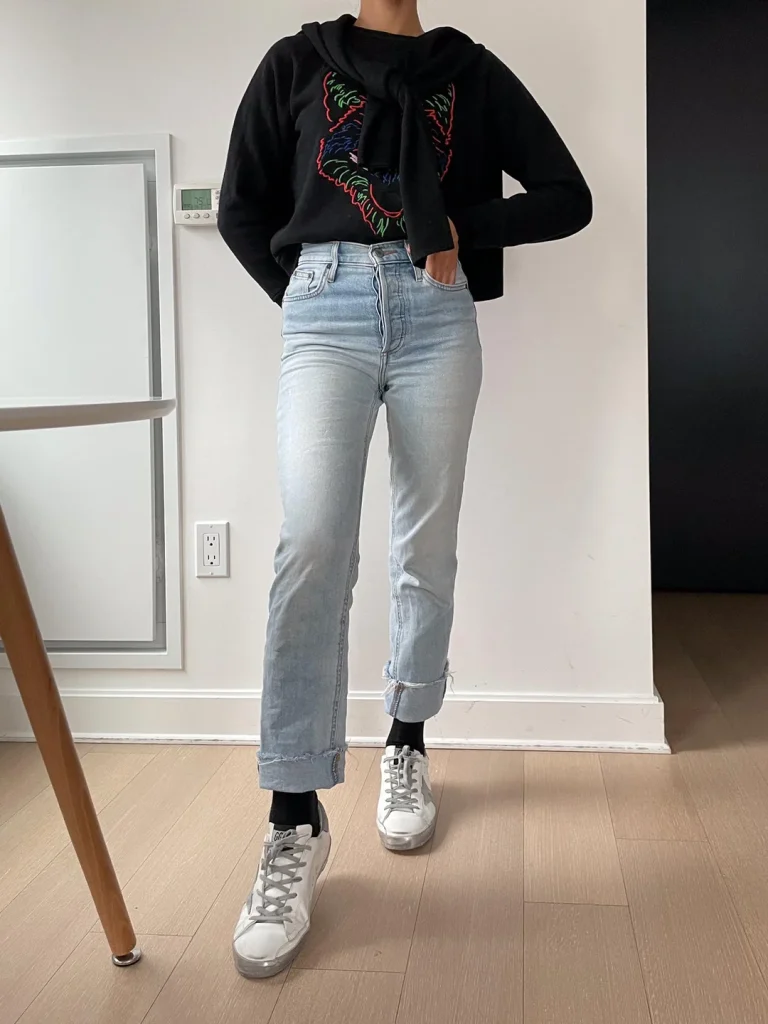 r/petit_moi_ keeps it street with that black hoodie featuring colorful graphic embroidery, paired with light-wash rolled jeans and white sneakers. This is the “I didn’t try but actually I did” uniform, and it’s a classic for a reason.