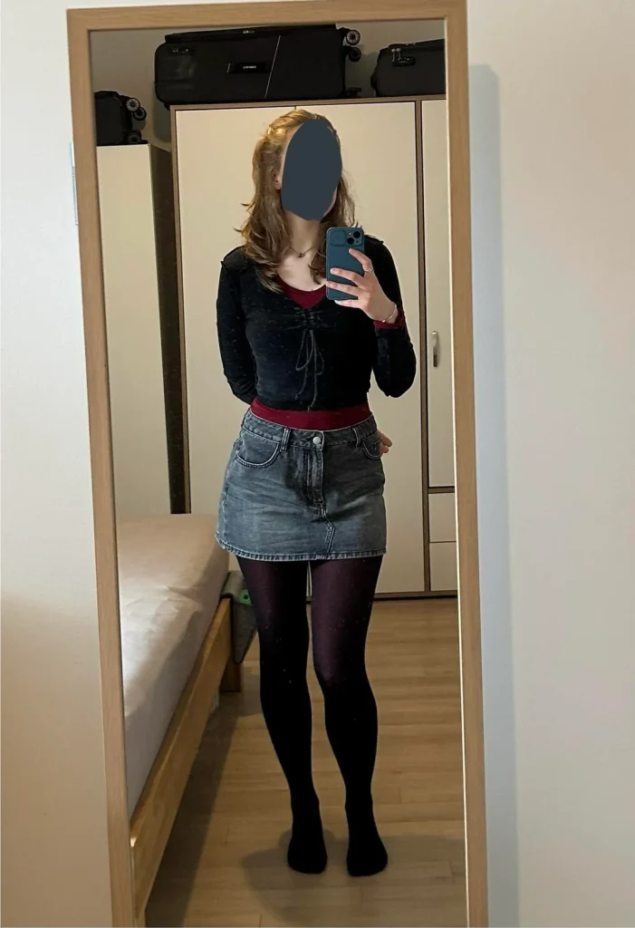 r/mirnator went full dark romantic with that black velvet lace-up top under a burgundy crop, paired with a denim mini skirt and black tights. This is vampire girlfriend energy meets streetwear practicality.
