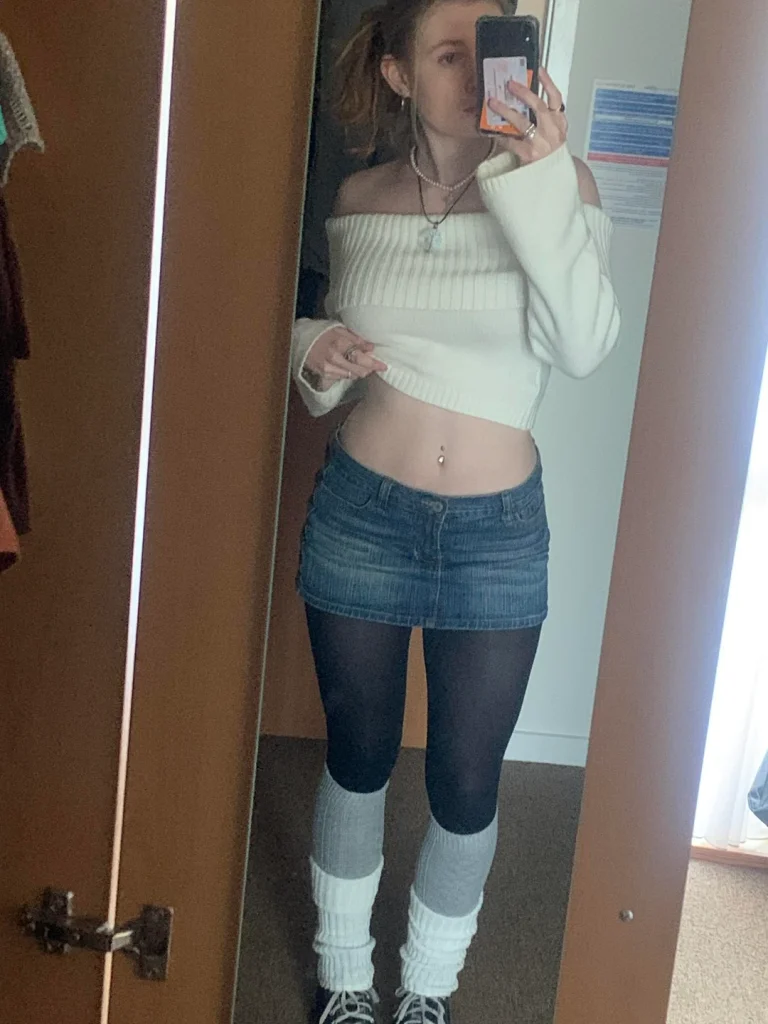 r/AOkkiutmoura went bold with that off-shoulder cream knit crop sweater over a denim mini skirt with sheer tights. This is polarizing fashion some people will love it, some won’t get it, but that’s kind of the point of streetwear aesthetic.