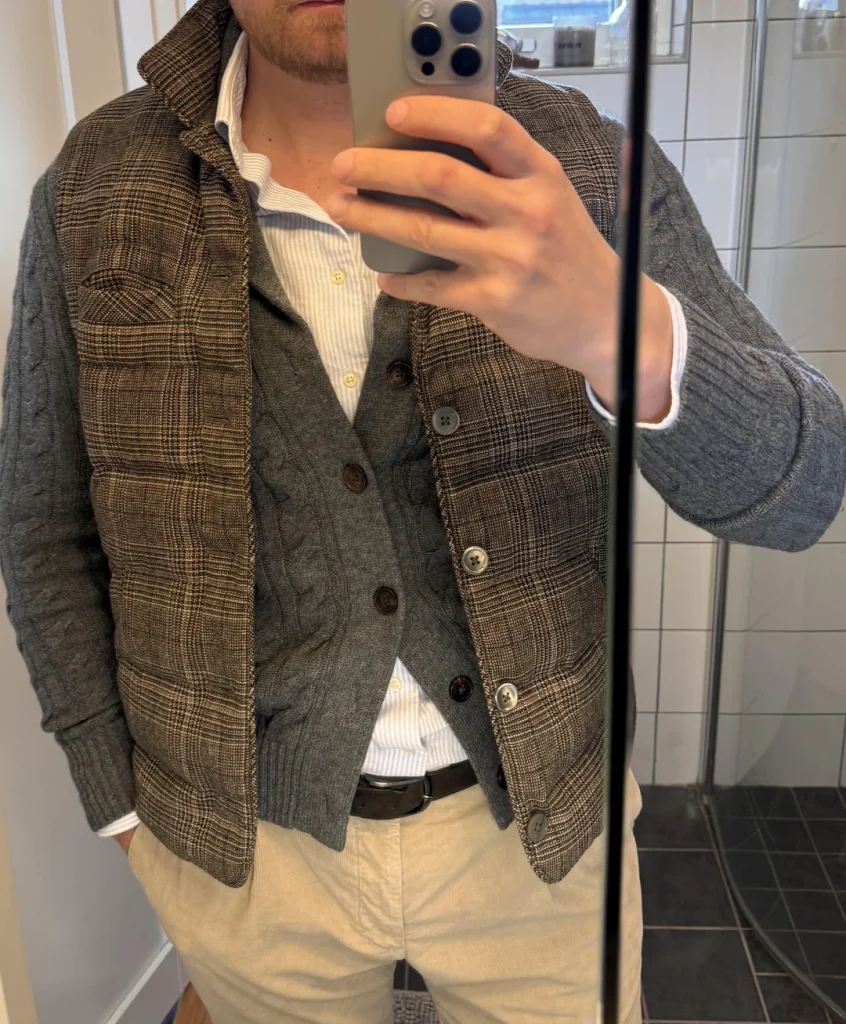 The plaid vest adds structure and visual interest, but those grey sleeves peeking out? That’s the detail that makes the whole thing work. It creates layers without bulk, and that striped shirt underneath adds another subtle pattern that somehow doesn’t clash. The light trousers keep the whole thing from feeling too heavy.
