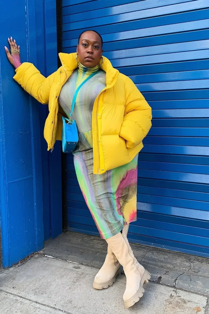 That yellow puffer is LOUD in the best possible way. It’s warm, it’s happy, it’s impossible to ignore. The tie-dye dress underneath brings in multiple colors that play off the jacket, and those platform boots? They mean business. This is what showing up as your full self looks like.