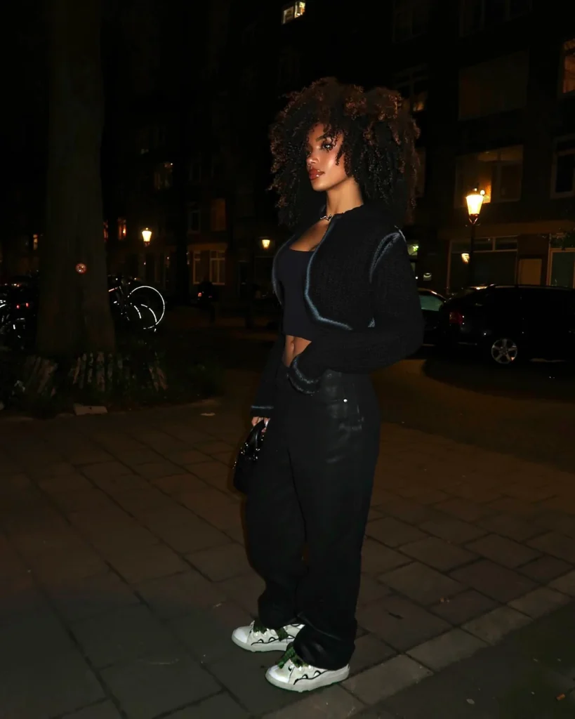 There’s something about all-black that just reads as “I’m serious about what I do.” That crop sweatshirt keeps it current and comfortable while staying within business casual bounds. The slightly oversized fit is modern without being sloppy, and those statement sneakers add personality without screaming for attention.