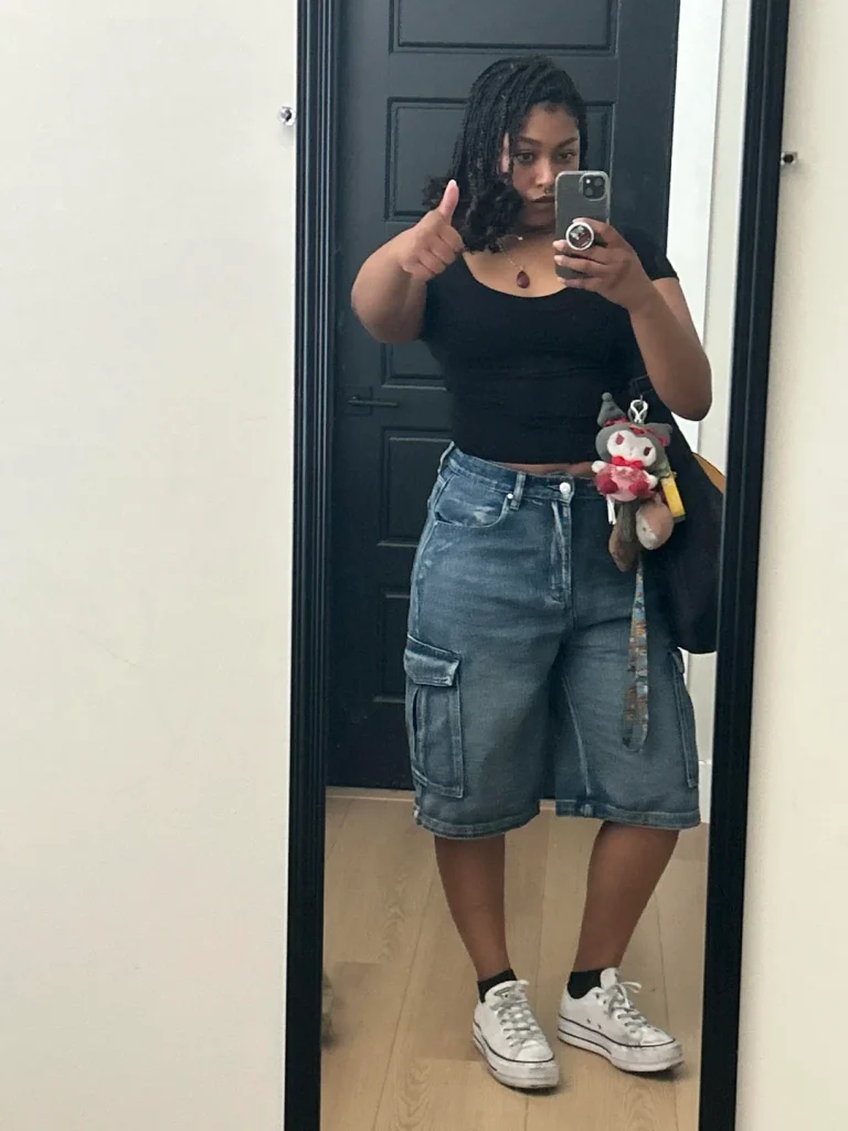 r/womensstreetwear wraps this up with a black crop tank, cargo shorts, and platform Converse. This is business casual at its most relaxed—perfect for creative offices, summer Fridays, or anywhere the dress code is more suggestion than rule.