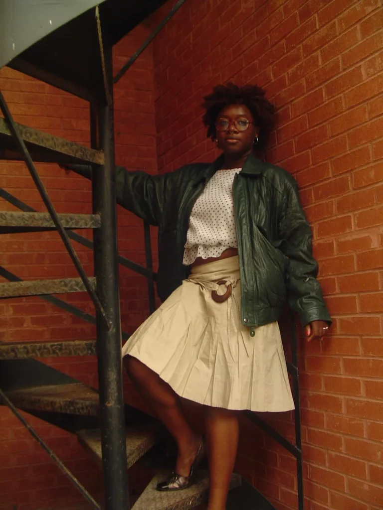 r/blackladies proves that casual doesn’t mean lazy with that green leather jacket over a polka dot top and skirt combo. This is thoughtful styling that looks effortless.