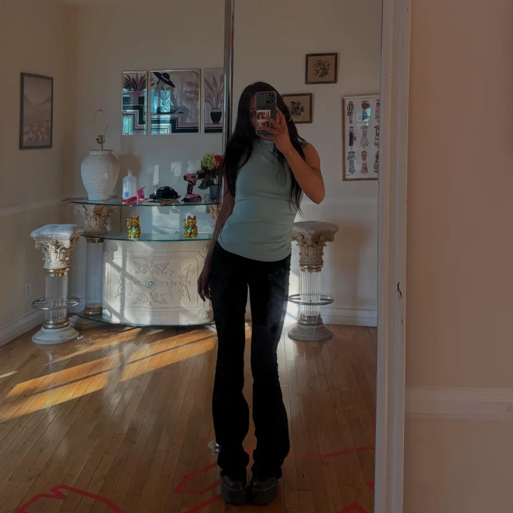 r/womensstreetwear keeps it simple and stunning with that sage green tank and black flare pants. Sometimes less really is more, and this outfit proves it.