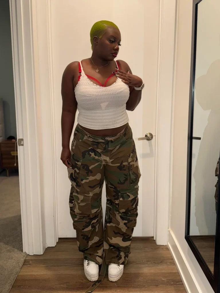 The textured white fabric elevates this beyond a basic crop top, and those red bra straps peeking through? That’s intentional styling. The camo cargo pants bring in an unexpected edge that keeps the whole look from being too sweet. Those chunky white sneakers ground everything and add to that “I just threw this together” vibe (that actually took 20 minutes to perfect).