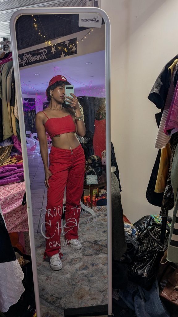 That red is doing heavy lifting here. It’s vibrant, it’s memorable, and it immediately sets a tone of “I know what I’m doing.” The crop top and high-waisted pants combo keeps things modern without crossing into inappropriate territory. And that baseball cap? Chef’s kiss. It adds personality and edge while staying completely wearable.