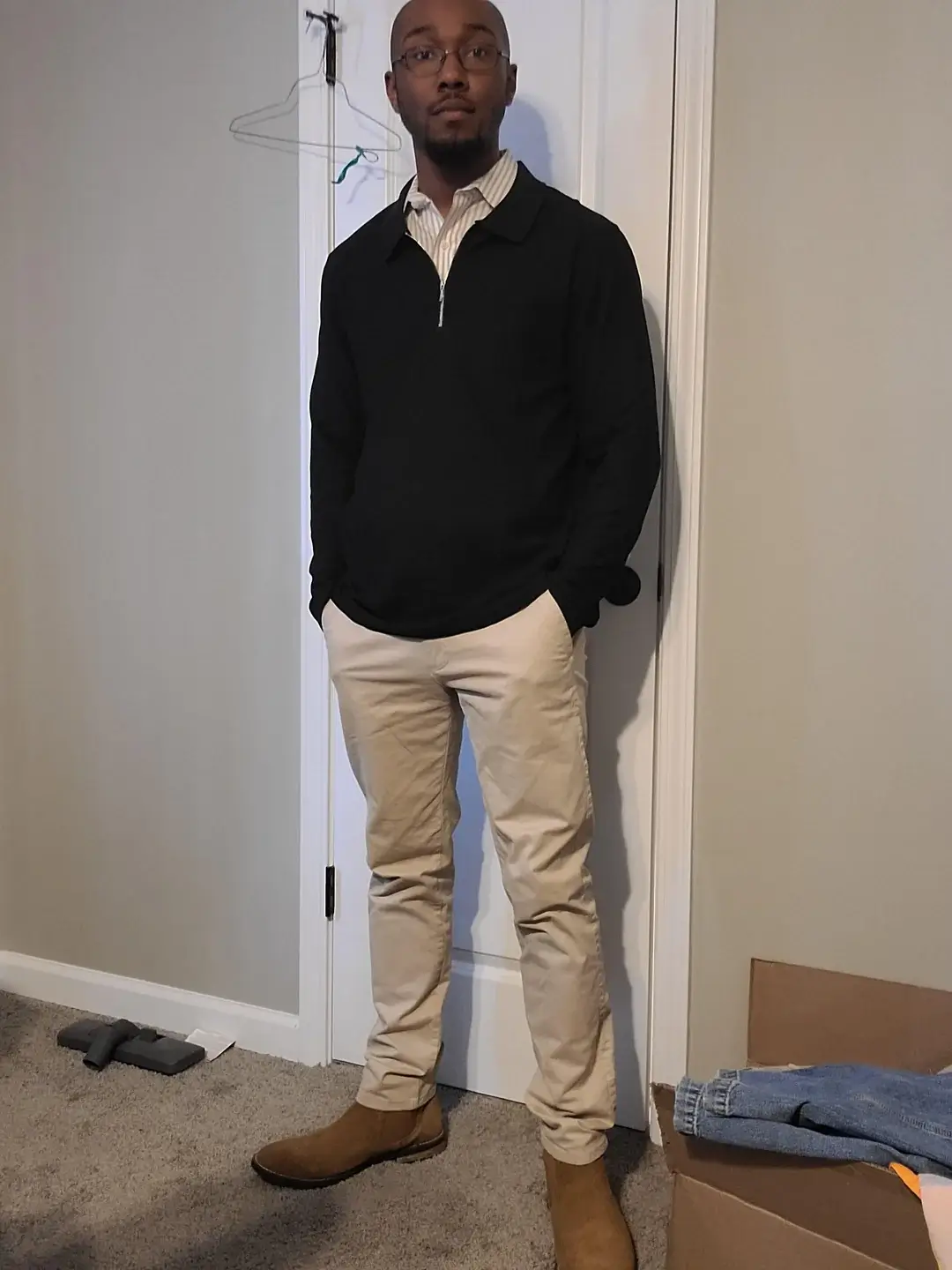 r/mensfashion proves that quarter-zips aren’t just for your dad’s golf outings with that black quarter-zip over a striped shirt and khaki chinos. This is smart layering that works in basically every office with heating that can’t make up its mind.