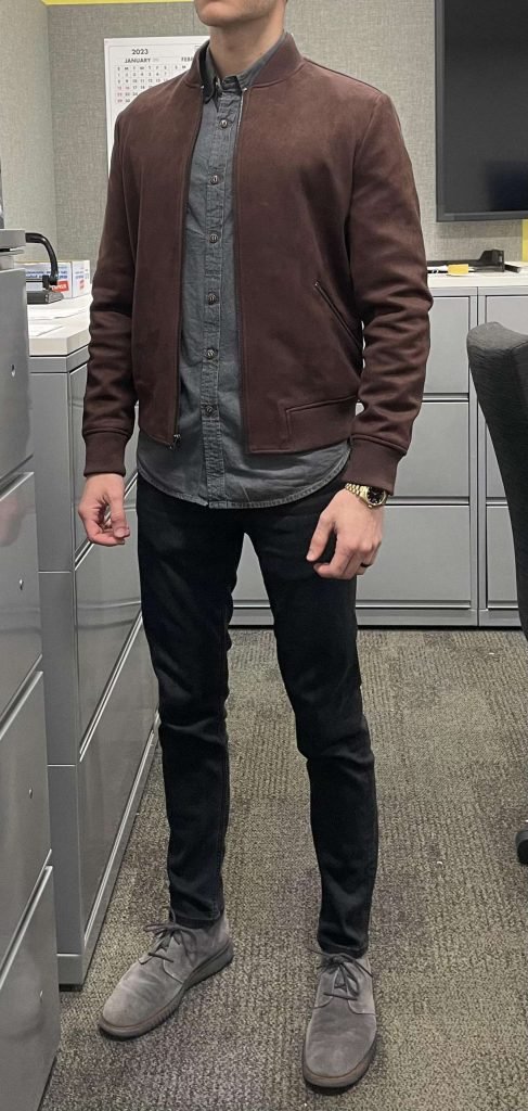 That suede-look bomber adds texture and personality without screaming for attention. The chambray shirt keeps it grounded and professional.