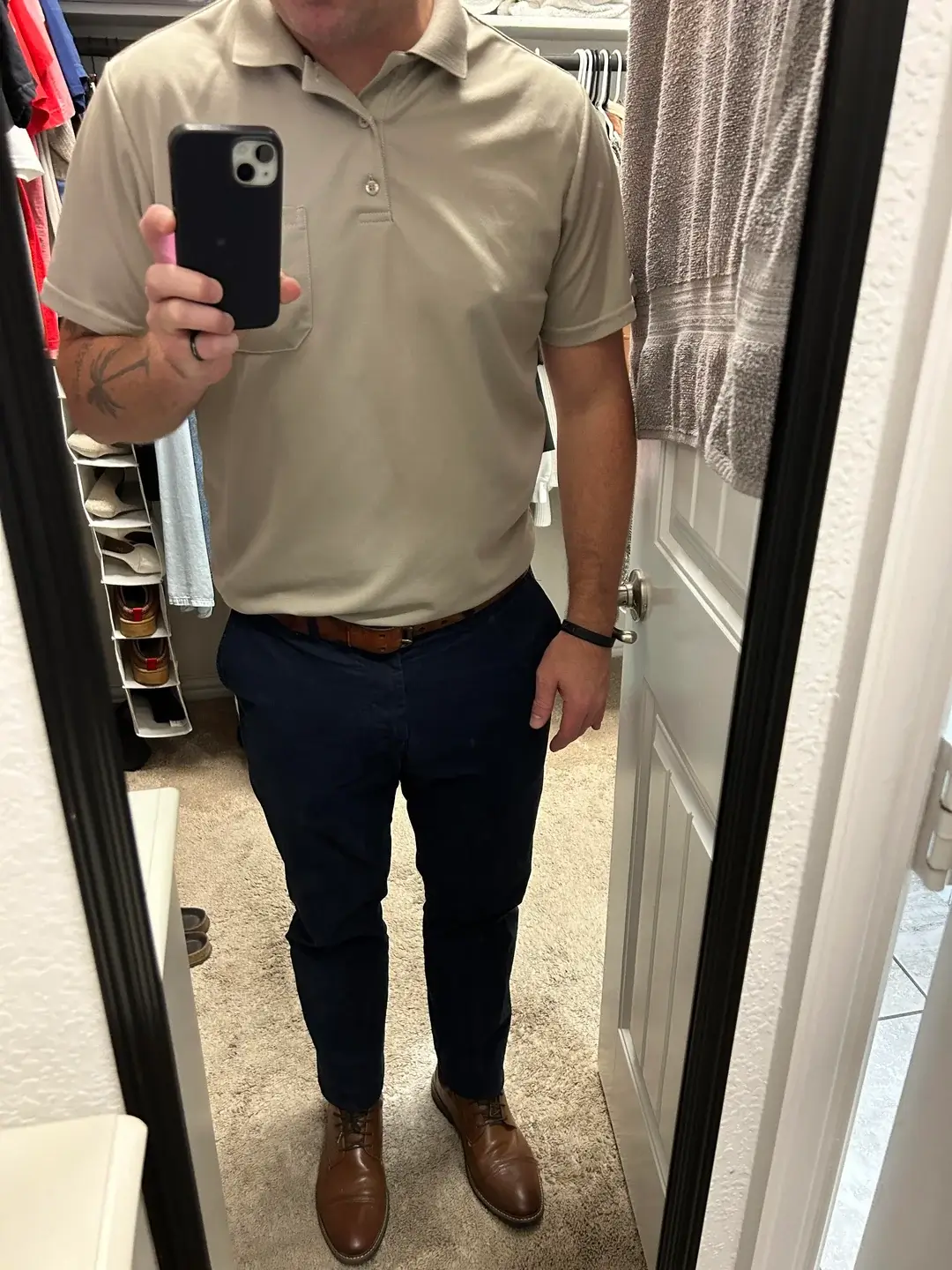 That polo hits right at the sweet spot—casual enough that you’re not overdressed, but structured enough that nobody questions whether you belong in the meeting.