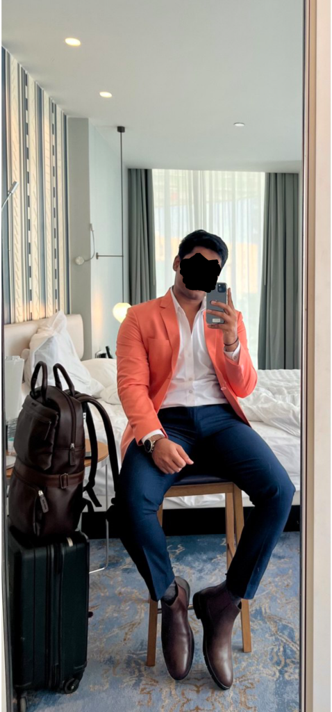 Most guys play it safe with navy, grey, or black blazers. But here’s the thing—a statement color like this makes you memorable. That coral pops against the neutral base, the white shirt keeps it from being overwhelming, and navy trousers ground the whole thing.