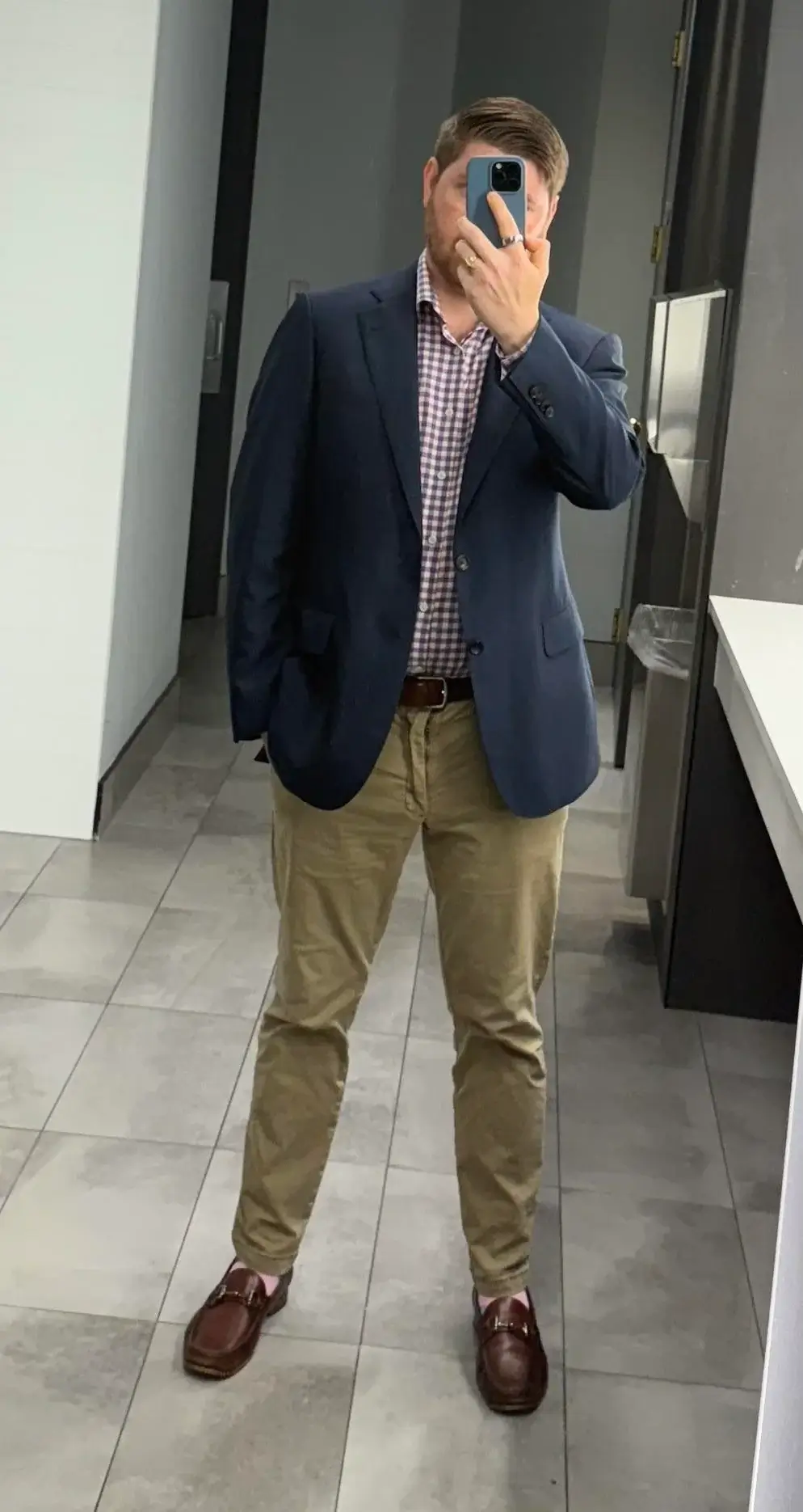 r/mensfashion demonstrates the truth we all need to accept: a good blazer makes any outfit instantly more professional. That navy blazer over a purple gingham shirt with khakis and brown loafers is textbook smart business casual.
