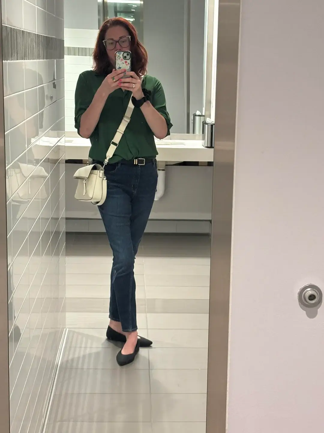 That green is doing all the heavy lifting. It’s rich, sophisticated, and instantly elevates even your most basic jeans. The three-quarter sleeves keep it professional while that cream crossbody bag adds a polished finishing touch.