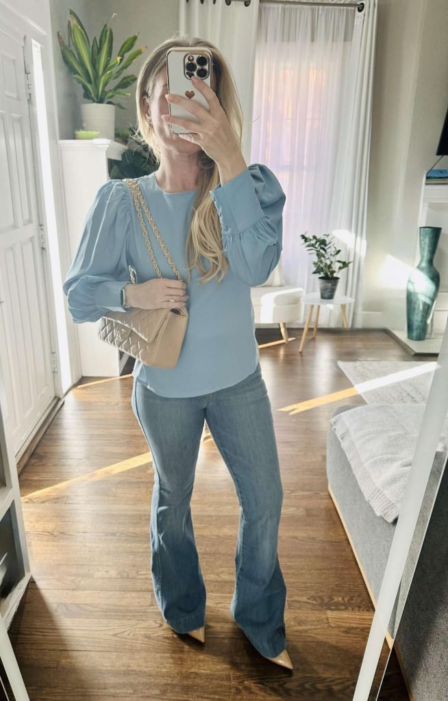 Sage blue with puff sleeves creates a feminine yet professional vibe. r/BusinessFashion keeps it elevated with that sage puff-sleeve top, flared jeans, and a quilted crossbody bag. This is what “effortlessly put together” actually looks like.
