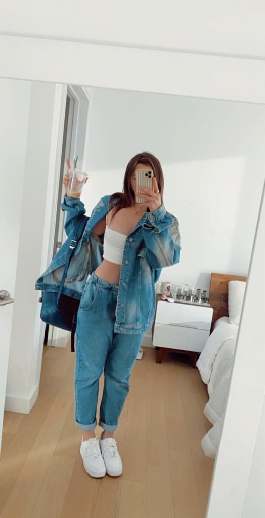 r/fashion rocks that denim jacket with white crop top and coordinating denim for a look that’s clearly thought-through. This is weekend meeting vibes or super casual Friday energy, and it absolutely requires confidence.