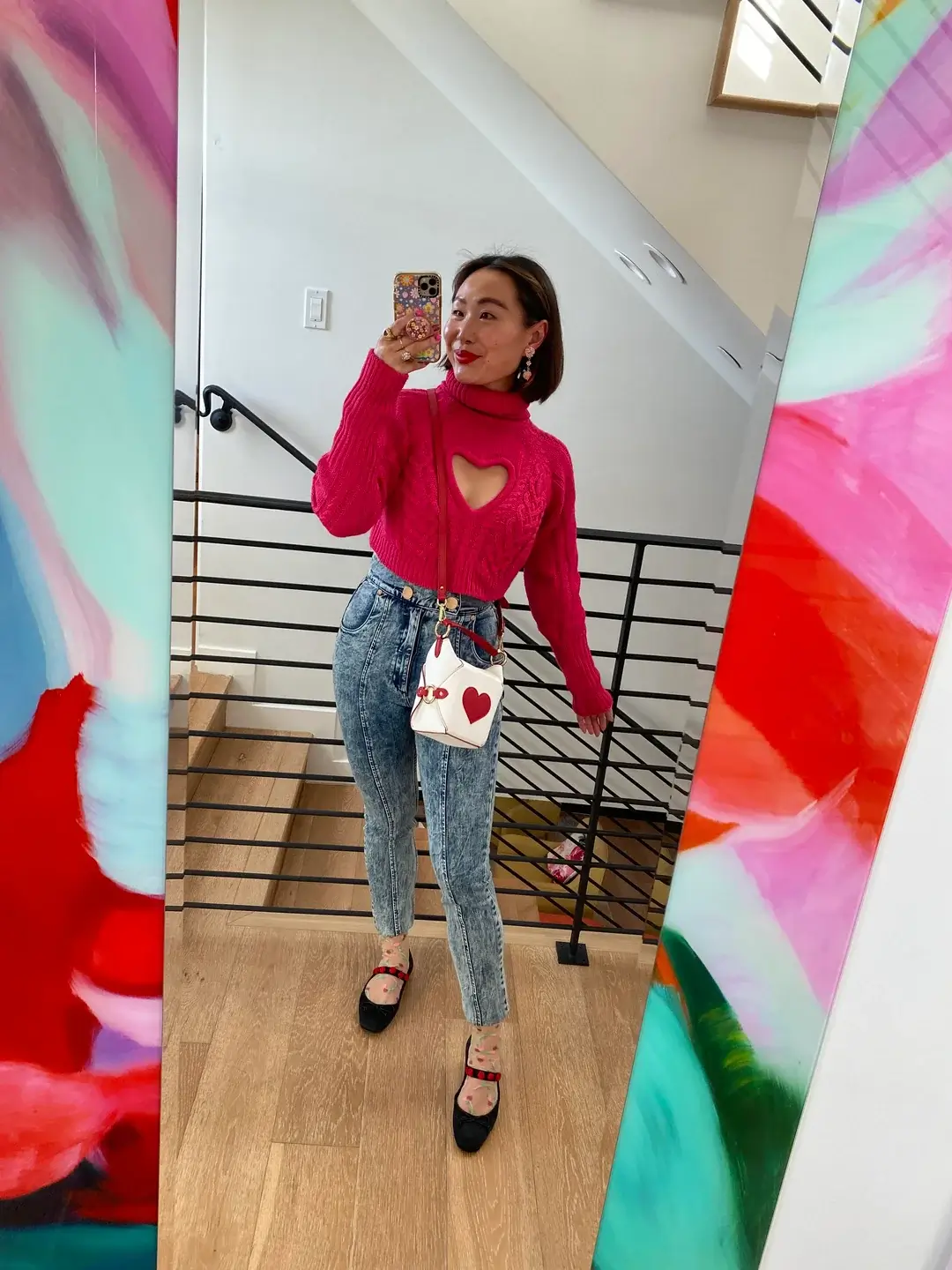 That hot pink cutout turtleneck is impossible to ignore in the best way. r/OUTFITS pairs it with acid-wash jeans for personality-driven dressing that still respects business casual boundaries (mostly). This is main character energy.