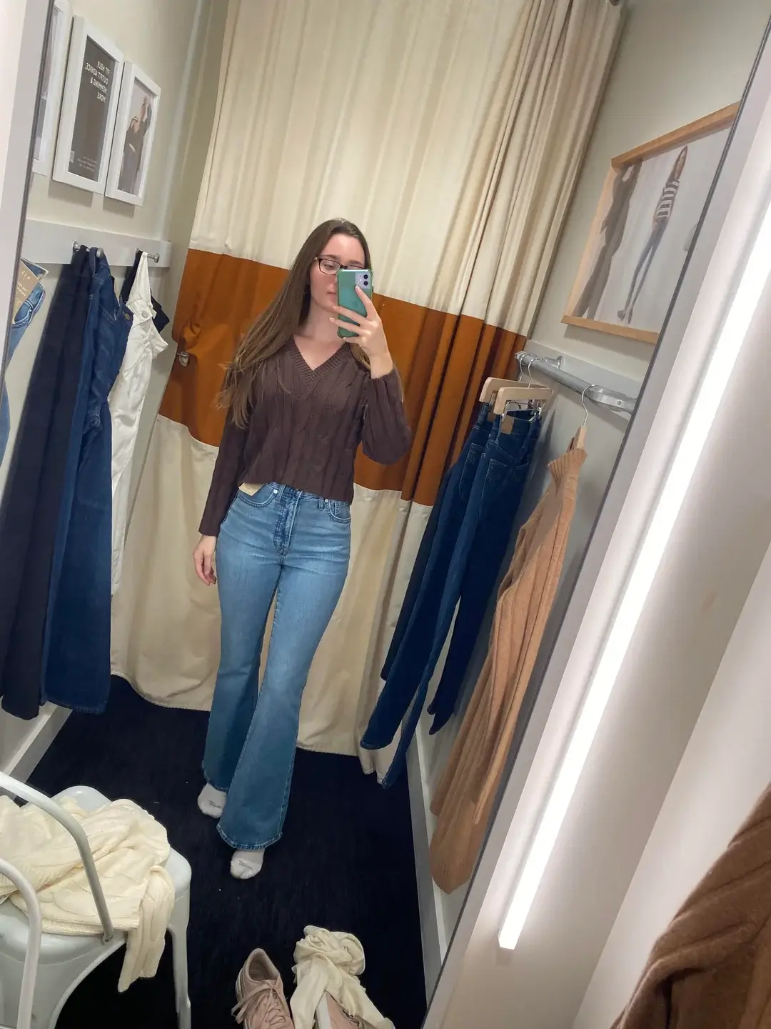 That brown cable-knit V-neck paired with light-wash flared jeans shows how texture adds interest while staying professional. r/OUTFITS gets it completely—the clean white sneakers and intentional styling make this work for casual Fridays or creative offices.