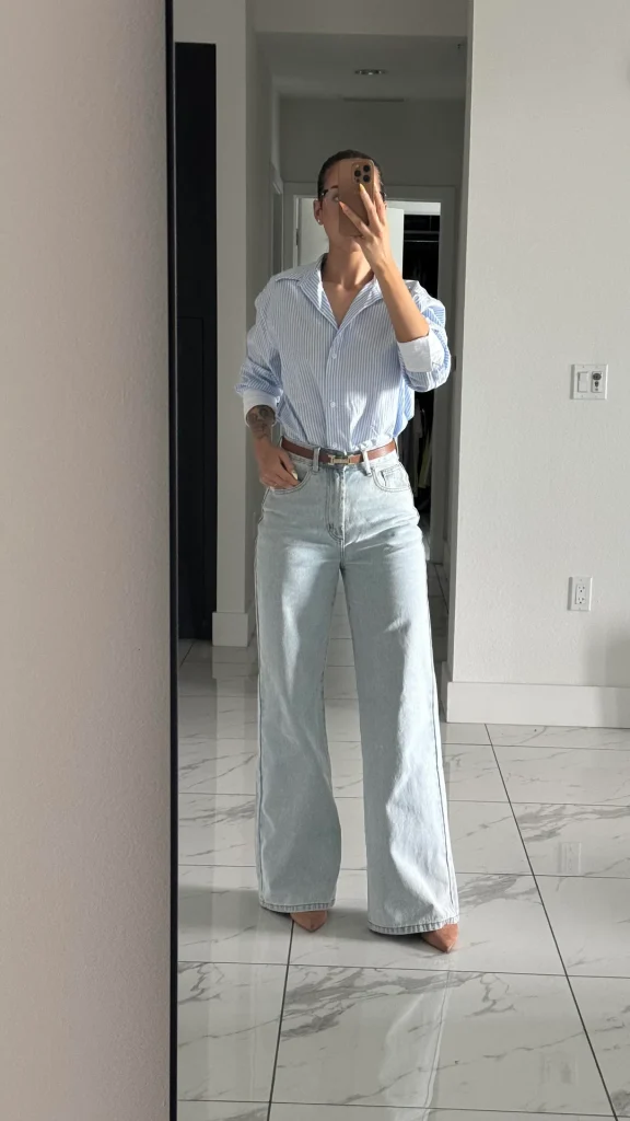 r/alexandrap21 keeps it classic with that blue pinstripe button-down tucked into light-wash wide-leg jeans with a brown leather belt. This is preppy-meets-modern done exactly right.