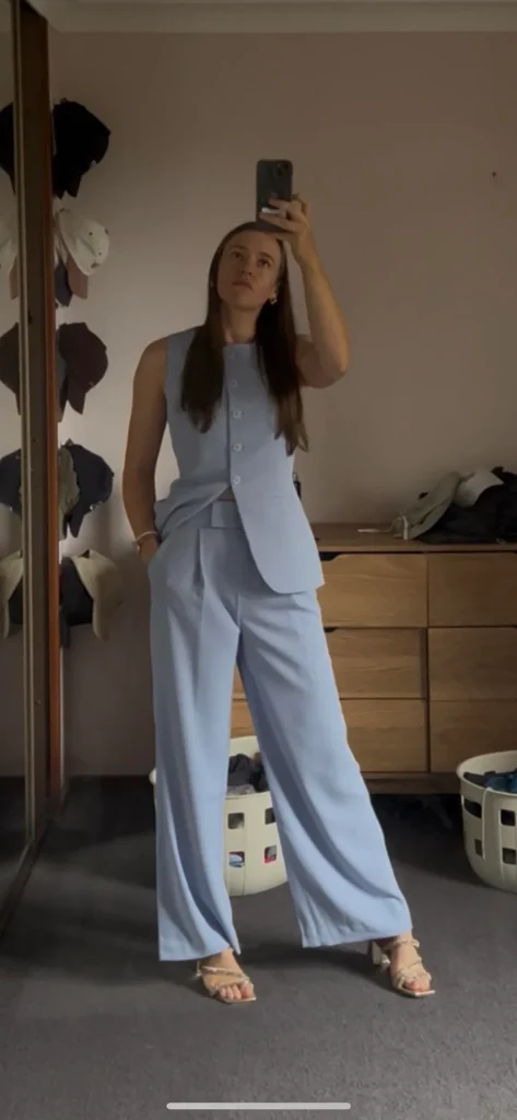 r/Signal-Screen3761 absolutely masters the coordinated look with that light blue sleeveless vest and matching wide-leg pants. This is polished casual that means actual business.