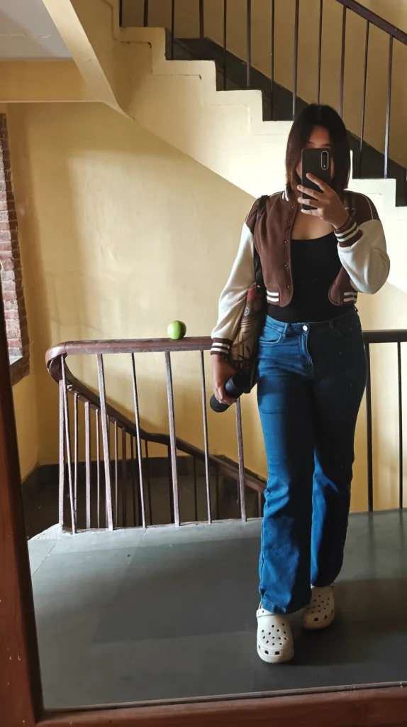 r/Embarrassed_Knee_630 brings back the varsity jacket with that brown and cream colorblock over a black top and blue jeans, and I’m genuinely here for this revival.