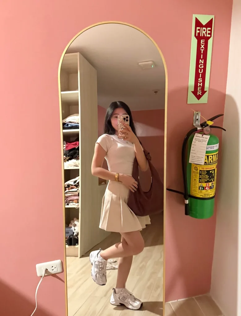 r/psychologia_ channels country-club vibes with that pale pink pleated mini dress and chunky sneakers, creating this perfect blend of preppy and modern.