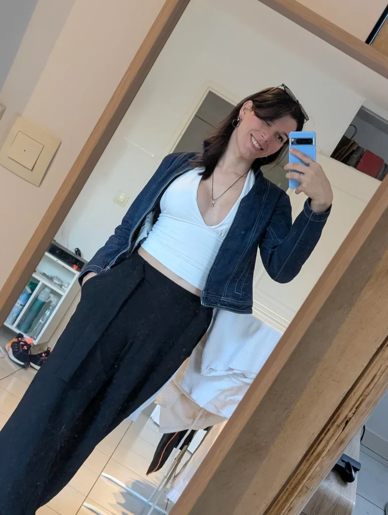 r/holyknightgirl nails the layering game with that denim jacket over a white crop top and black wide-leg pants. This is casual layering done exactly right.