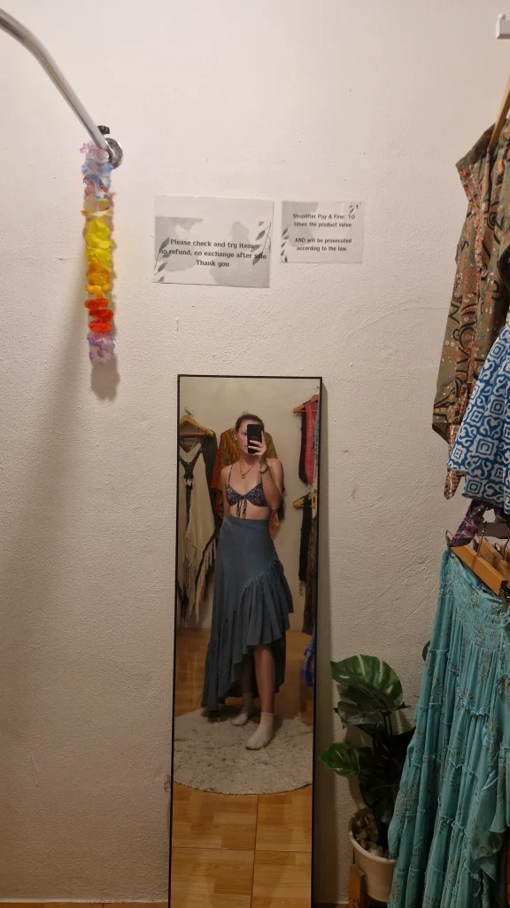 r/picollinopanda is literally in a store trying on that gray-blue asymmetrical midi skirt, and even in a fitting room with fluorescent lighting, the outfit works. That’s how you know it’s good.