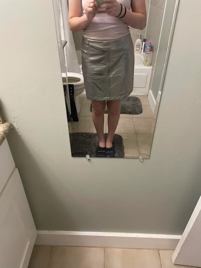 That metallic skirt could easily veer into “too much” territory, but the muted silver-gray tone keeps it wearable and versatile. Paired with a simple fitted tank, it’s just enough interest without crossing into costume territory.