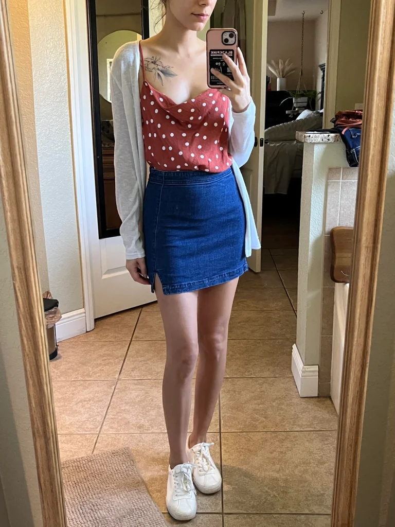 r/deleted brings major vintage-inspired energy with that rust-red polka dot cami, light cardigan, and denim mini skirt. This is cottage-core meets casual cool, and it’s working.