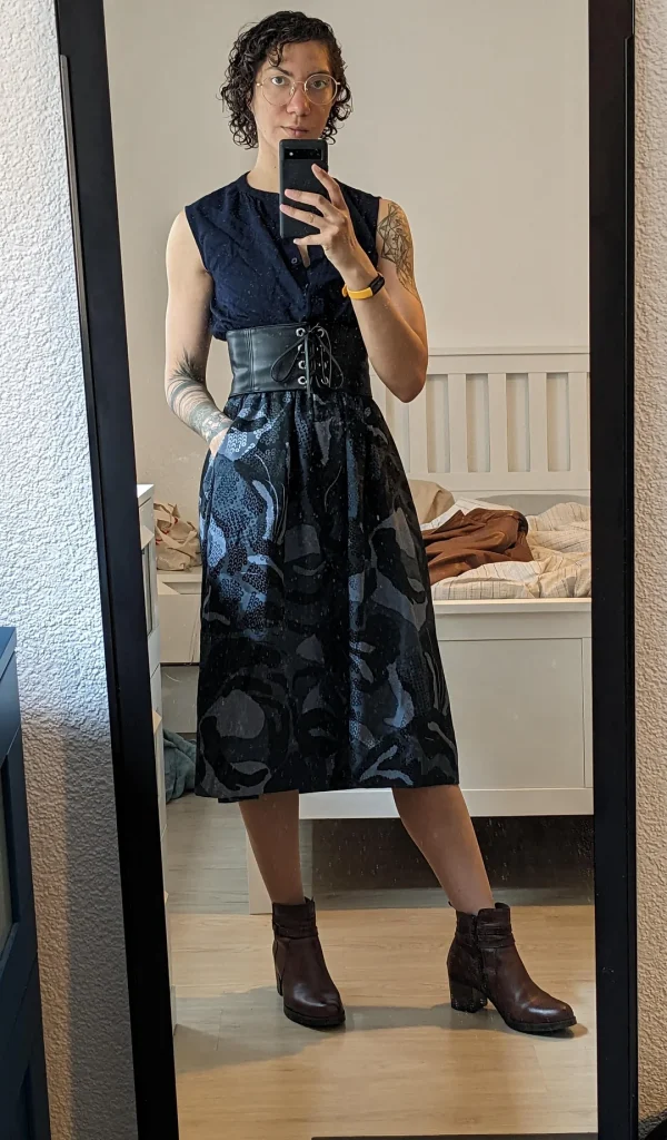 r/WhidperOlk masters the art of making one piece do all the work with that dark floral midi dress and corset belt. This is sophisticated without being stuffy.