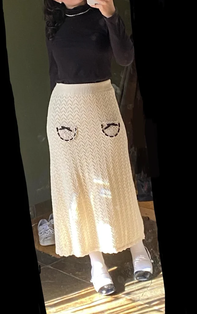 That knit skirt is special—you can see the cable-knit texture, those contrasting pocket details add character, and the cream color is soft and sophisticated. The black mesh top underneath creates a subtle contrast without being too dramatic.
