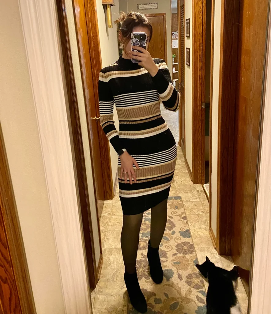 r/wheresmytwodollars keeps it simple and effective with that black and tan striped sweater dress and tights. Sometimes the best casual winter outfits are the ones that require zero mental energy.