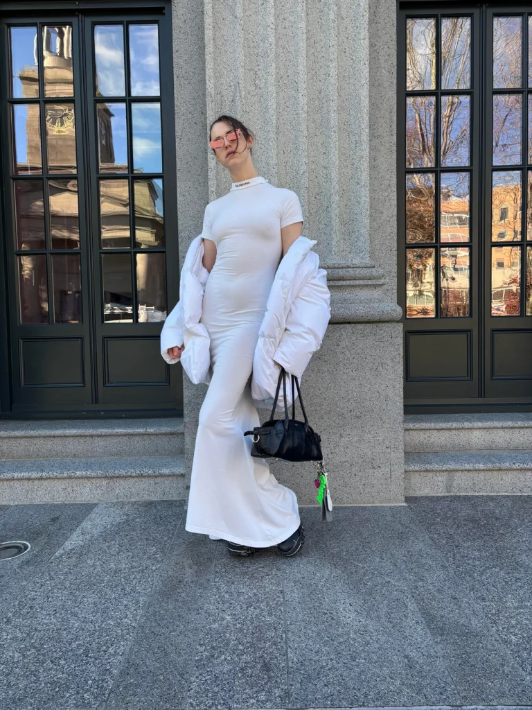 Everyone wears dark colors in winter, which is exactly why all-white stands out so dramatically. That white puffer coat is clearly warm, the bodycon base creates shape, and going monochrome always reads as intentional and sophisticated. Yes, you’ll worry about spills more, but the confidence boost might be worth it.