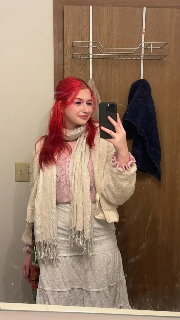 r/Revolutionary_Bunch2 absolutely nails the art of layering with that cream and pink situation. Look at this—a pink knit base layer, cream fuzzy cardigan, scarf action, and it all somehow works together instead of looking like a fabric explosion.