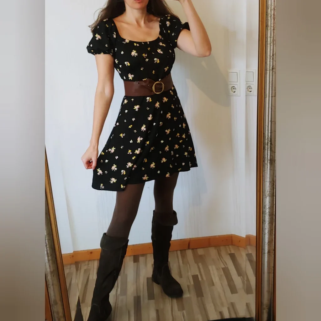 r/Hefty-Philosopher582 proves winter doesn’t mean sacrificing feminine style with that floral dress, tights, and boots. This is “cozy but make it cute” executed perfectly.