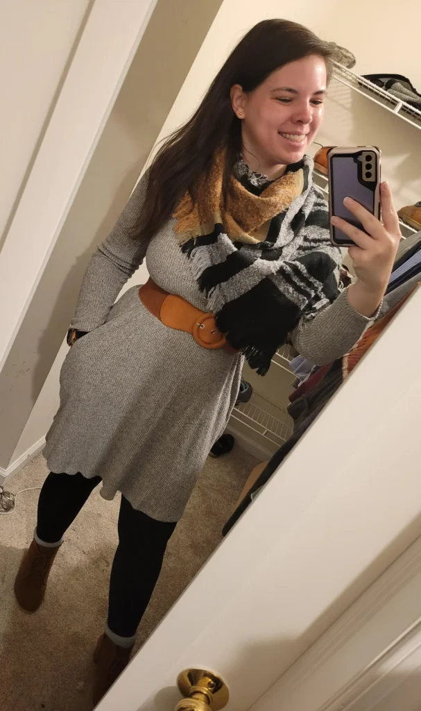 Sweater dresses are genuinely underrated for casual winter situations. You get the comfort of basically wearing a blanket, but it reads as an actual outfit. Add tights, boots, and a scarf, and suddenly you look like you know what you’re doing. That tan belt is genius too—it creates shape and prevents the “shapeless sack” problem that ruins so many cozy looks.