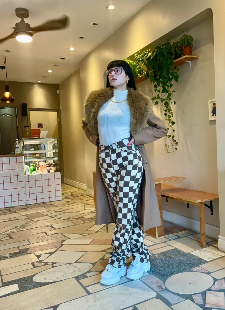 r/sarahfreia goes bold with that fur-collar coat, baby blue turtleneck, and checkered pants. This is for people who want their casual outfits to have personality.