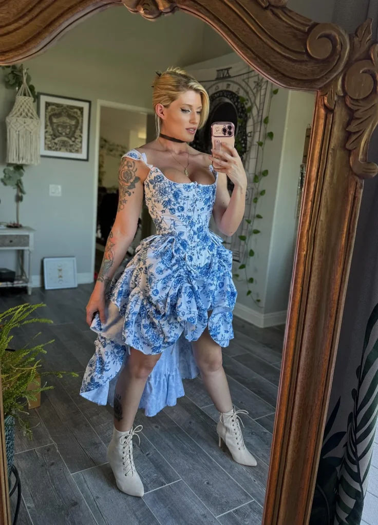 r/Ink_And_Lavender brought fantasy to life with that blue and white floral corset dress with the dramatic high-low hem and those cream lace-up boots. This is cottagecore meets fairytale and it’s absolutely magical.