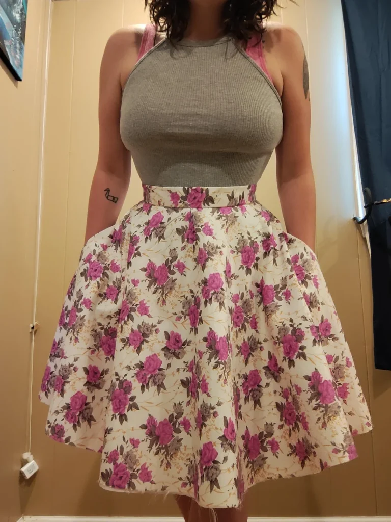 That ribbed halter creates clean lines on top while the dramatic floral print does all the talking below. The volume in that skirt is everything it’s got that twirl factor that makes you feel like you’re in a music video just walking to get coffee.