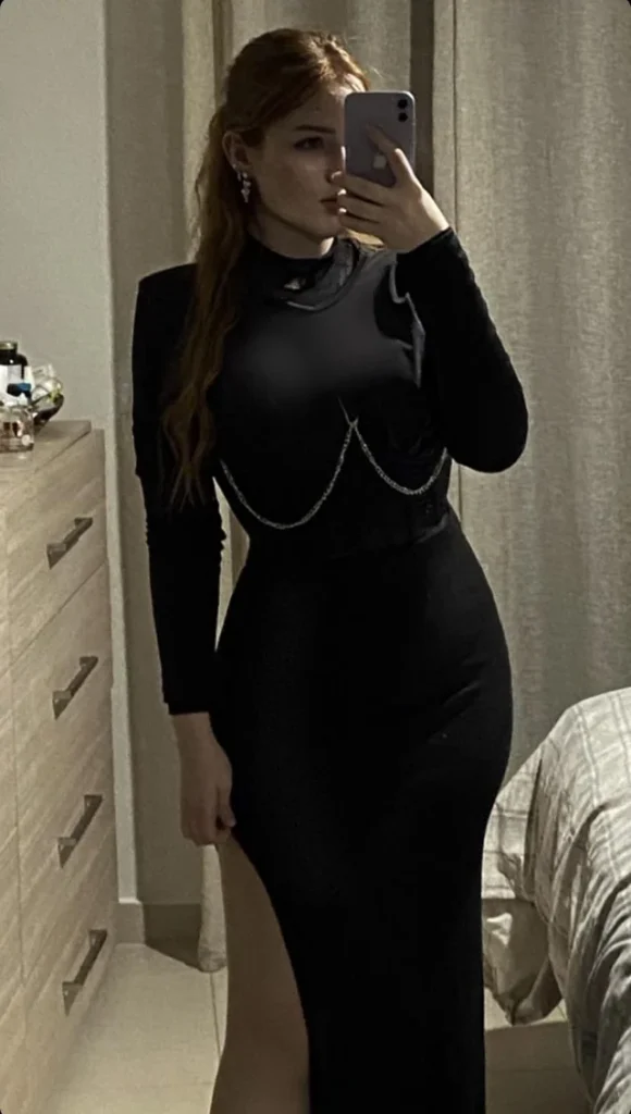 r/Huge_Meeting9080 proves you don’t need color to make an impact with that all-black long-sleeve top, body chain, and fitted midi skirt. This is understated elegance with a twist.