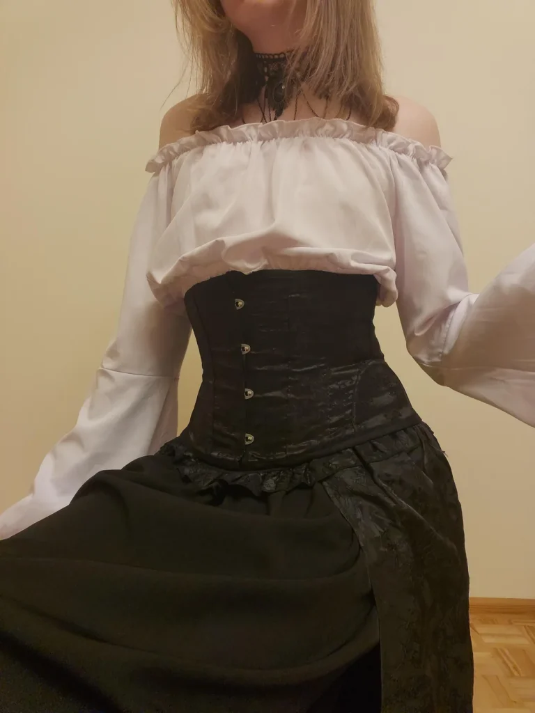 That off-shoulder blouse with the gathered sleeves creates this ethereal, romantic base. Then the corset adds structure and creates that classic Victorian silhouette we’re all obsessed with. And that high-low skirt with the train? That’s the kind of drama that makes an entrance.