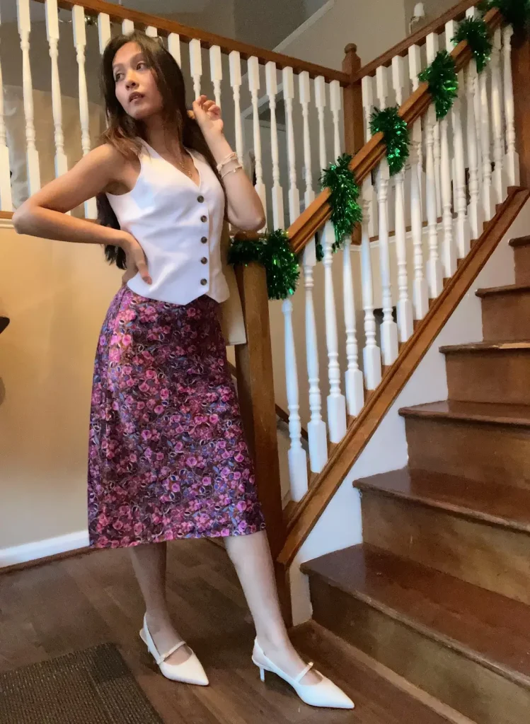 r/BusinessFashion proves that feminine doesn’t mean unprofessional with this white button vest and purple floral midi skirt combo. Those white kitten heels? Chef’s kiss.