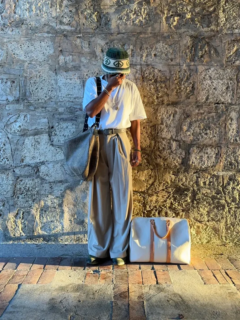 Okay, r/streetwear went full fashion-forward with these cream wide-leg trousers and an oversized white tee. That bucket hat? Bold choice that somehow works.