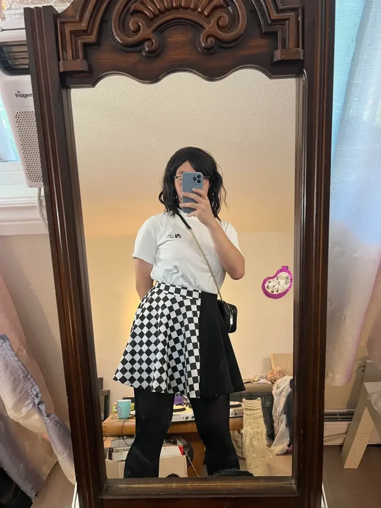 r/crossdressing shows off a white ribbed shirt with a black button-front skirt. This outfit is giving “effortlessly chic” in the best way.