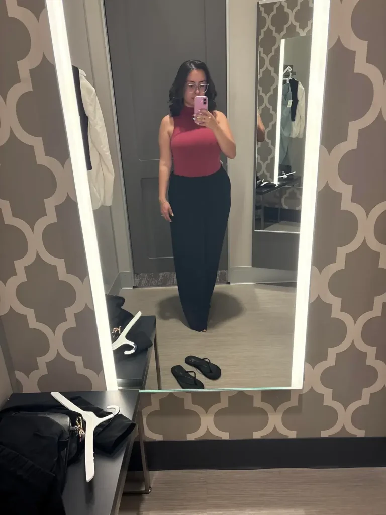 r/BusinessFashion goes bold with a burgundy sleeveless top and black wide-leg pants. This color combo is chef’s kiss for fall offices.