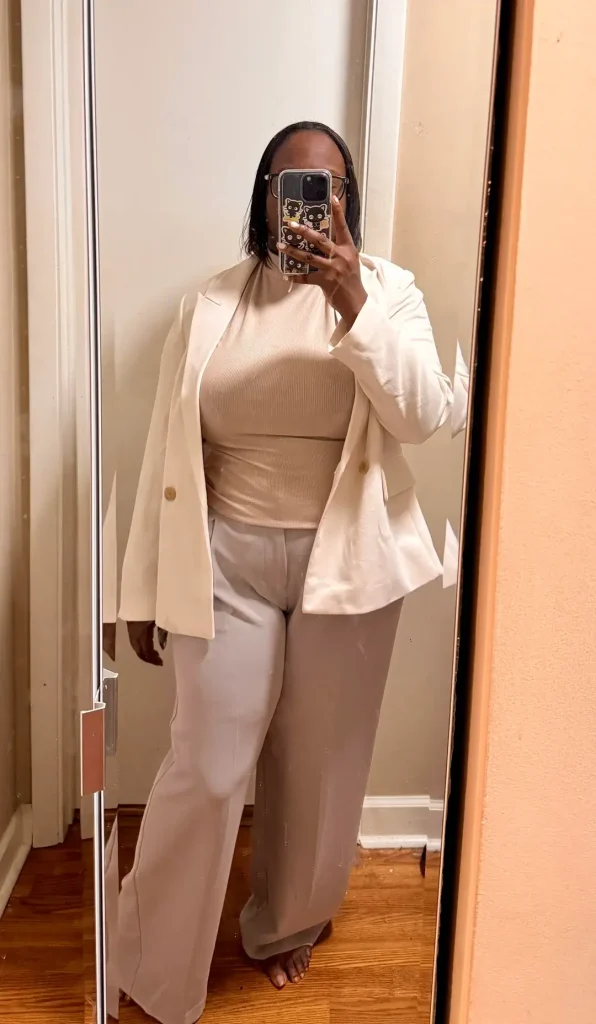 r/Midsizefashion masters the neutral game with a beige turtleneck, white blazer, and cream wide-leg pants. This is giving “I have my life together and maybe a vacation home.”